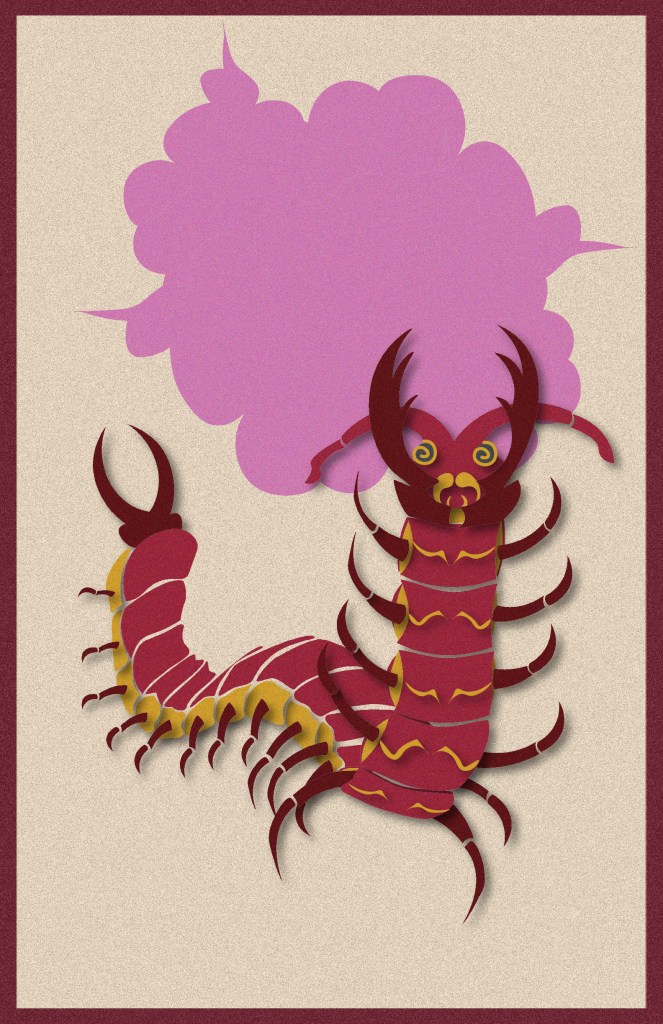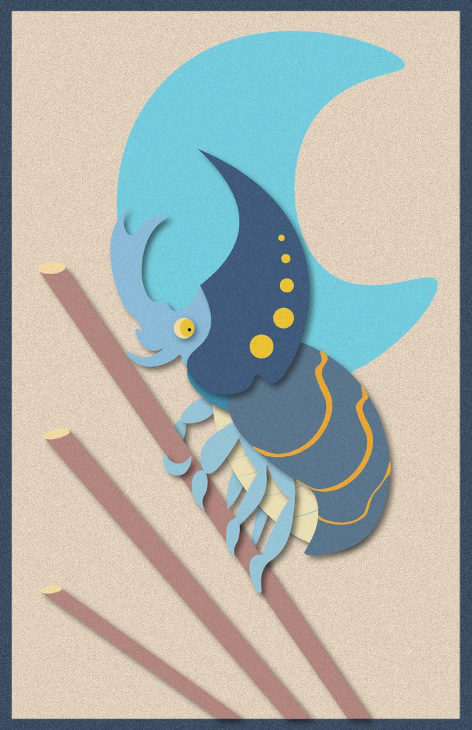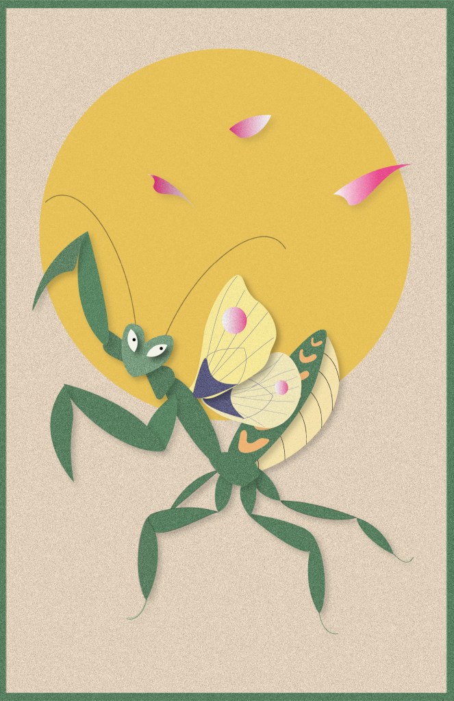 Students were asked to create a vector animal using basic shapes in the style of artist Charley Harper for the Illustrator class. After researching insect realistic pictures, I got inspired and decided to go with the praying mantis, the rhinoceros beetle & the scolopendra. I found these animals very gracious when they pose against their opponents. I applied a grain texture to the design to give a paper effect to the composition.